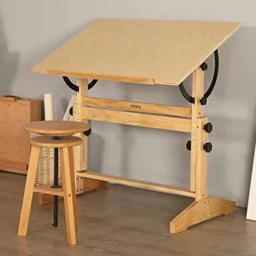 VISWIN 33"-39" H Wooden Drafting Table, Adjustable Height & Angle, Solid Pine Wood Artist Table for Drawing, Tilts Flat, Studio Art Craft Desk for Painting, Drafting, Writing, Reading