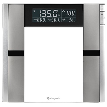Show moreMeet the remarkable Vitagoods Form Fit Digital Scale and Body Analyzer, the ultimate tool for health enthusiasts eager to revolutionize their wellness journey. This innovative device goes beyond conventional weighing scales by delivering a comprehensive analysis of your body composition. With its cutting-edge Bio Impedance Analysis (BIA) technology, the Vitagoods scale accurately measures your body fat percentage, muscle mass, water weight, and bone density, transforming the way you approach your health. No more guessing about your fitness progress; now you can track it all with precision!
