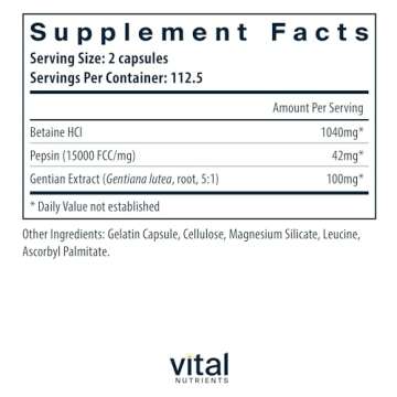 When compared to other digestive enzyme supplements on the market, the Vital Nutrients Betaine HCL Pepsin stands out due to its unique combination of ingredients. While many competitors focus solely on enzyme blends, this formula benefits from additional support from betaine HCL and gentian root extract, providing a holistic approach to digestion. Moreover, our commitment to clean, allergen-free formulations ensures peace of mind for consumers with sensitivities. Many products may contain fillers or allergens; however, ours prides itself on maintaining purity and quality, backed by third-party testing.
