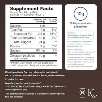 Show moreElevate your coffee experience with the Vital Proteins Collagen Coffee Creamer, a lush, coconut milk-based delight that offers nourishing benefits while complementing your favorite beverages. Each serving is packed with 10g of collagen peptides to support your skin, hair, and nails, along with 9g of energizing Medium Chain Triglycerides (MCTs) that help boost your metabolism. From the health-conscious to the busy individual on-the-go, this creamer is a game changer. Transform your morning routine with the delightful flavor of mocha!