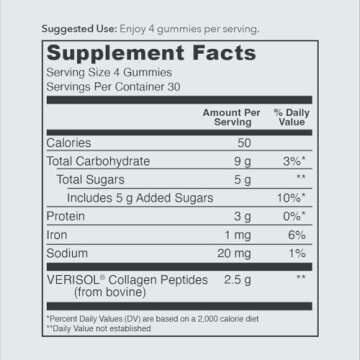 Show moreIntroducing the Vital Proteins Collagen Gummies, a delicious and convenient supplement designed to promote youthful vitality from within. Each gummy is infused with a clinically-tested dose of 2.5g of VERISOL Collagen Peptides, specifically formulated to fight visible signs of aging such as fine lines and wrinkles while also providing essential support for your hair and nails. These gummies are not just a treat for the taste buds, thanks to their natural grape flavor, but they also deliver a powerful boost of collagen that your body desperately craves as it ages.