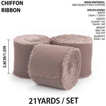 Show more Introducing the Vitalizart Brown Handmade Chiffon Silk Ribbon Fringe, a must-have for any DIY enthusiast or event planner! This exquisite set comprises three rolls, providing a generous total of 21 yards of luxurious chiffon ribbon, each measuring 1.5 inches wide x 7 yards long. Crafted from premium silk-like chiffon material, this ribbon boasts an incredibly sheer and soft texture that not only looks elegant but also facilitates easy crafting and cutting to any desired length. Whether you are aiming for a classic or contemporary theme, its rustic frayed edges add a charming touch to your creations.