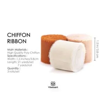 Show more Transform your special occasions with our exquisite rolls of premium silk-like chiffon ribbon. Crafted from a uniquely soft material that feels heavenly to the touch, each roll measures 1.5 inches wide and provides an impressive 7 yards, offering you a total of 21 yards of sheer elegance. The handmade rustic frayed edges give this ribbon a charmingly organic aesthetic, making it perfect for a variety of applications.