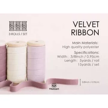 Vitalizart Velvet Ribbon Pink White Set 3/8" x 15 Yd Wooden Spool Fabric Trim 3 Rolls * 5 Yd for Christmas Wreath Decoration Handmade Craft Ornaments Gift Wrapping & Bow Making
