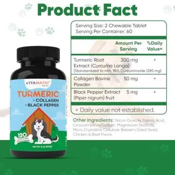 Show more Introducing the Vitamatic Turmeric for Dogs Anti Inflammatory Pain Relief, a premium blend specially formulated to support your furry friend’s joint and overall health. Each bottle contains 120 chewable tablets that are not only chicken and beef flavored to appeal to even the pickiest dogs but also packed with powerful ingredients like Curcumin, Collagen, and Black Pepper. This delightful formula is designed to provide antioxidant support and aid in maintaining normal joint, gastrointestinal, and cardiovascular health, helping your dog feel their best every day.