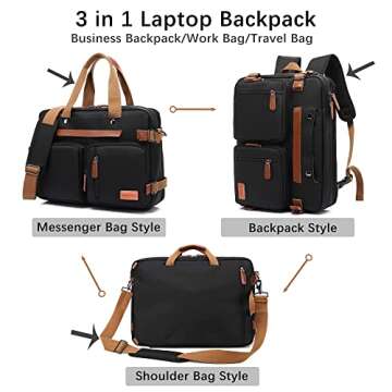 Show moreIntroducing the VITARVIX 3 in 1 Laptop Backpack, the ultimate companion for modern professionals and students alike. This versatile laptop bag, designed to hold up to a 17.3-inch laptop, seamlessly transitions between a messenger bag, shoulder bag, and backpack, making it perfect for various occasions—from daily commutes to long-haul flights. Crafted with high-quality materials, this bag not only prioritizes functionality but also boasts a stylish and sleek aesthetic, available in a contemporary black finish that suits both men and women. You'll find that it excels in every aspect, combining ease of use with a design that stands out.