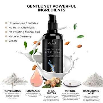 Show more Prepare to rejuvenate your skin with the remarkable Stem Cell Anti-Aging Cream featuring the powerful duo of Hyaluronic Acid and Retinol. This luxurious cream is expertly crafted to deeply hydrate, unclog pores, and enhance your overall skin texture, delivering results that can transform your appearance. With each application, you'll feel the rich, nourishing benefits of Shea Butter, derived from the Quercetin-rich Karite Tree, which not only moisturizes but also infuses your skin with vital fatty acids and antioxidants. For added hydration, this cream includes Almond Oil, renowned for its triglycerides and fatty acids, ensuring a long-lasting effect that beautifully supports your anti-aging skincare routine.