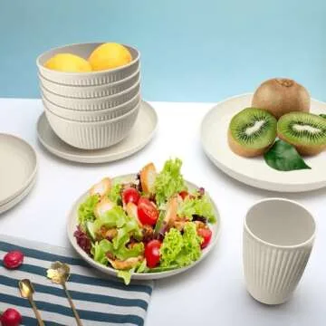 Show more This Dinnerware Set is the perfect addition to any dining experience, combining practical functionality with a chic design. Made from wheat straw fiber and food-grade PP, these dishes are not only eco-friendly but also BPA-free, ensuring a safe dining environment for your family. With a service for eight, this set includes 8 Dinner Plates, 8 Dessert Plates, 8 Dinner Bowls, and 8 Cups, making it an ideal choice for family meals and gatherings. Each piece boasts a unique matte texture enlivened with wheat fiber particles, giving it a contemporary yet timeless appeal.