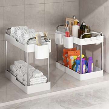 Imagine a tidy space where all your essentials are within arm's reach, eliminating clutter and chaos. Its two-tier design allows you to categorize your items efficiently, so you never have to dig through a mess again. With five removable hooks and four hanging cups, you can maximize your storage potential, keeping sponges and smaller items neatly in place.