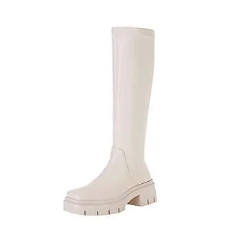 Vivianly Women's Chunky Heel Knee-High Boots - Zipper Square Toe, Platform Booties, Beige, Size 8