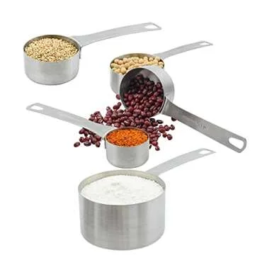 Show more Introducing our exceptional set of 5 Measuring Cups, designed to elevate your cooking and baking experience! Crafted from premium quality 18/8 (304) stainless steel, these cups boast a stunning stain finish that not only enhances their aesthetic appeal but also ensures durability and longevity. Say goodbye to rust with these stylish measuring essentials that are built to last a lifetime.