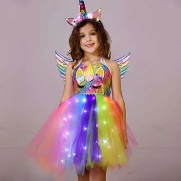 Viyorshop Girls Unicorn Costume LED Light Up Tutu Dress Up Birthday Gifts Princess Dress for Halloween Party(Rainbow Sequins, 5-6 Years)