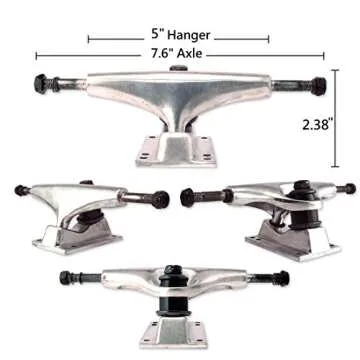 The mid-sized trucks feature a 5-inch hanger and a 7.6-inch axle, crafted from sturdy aluminum with 90A hardness bushings and a 6-hole baseplate configuration. This universal fit accommodates both old school and new school patterns, making it an excellent choice for most skateboarders whether they prefer street or park skating. You’ll appreciate the solid performance that these trucks bring, allowing for smooth turns and stability at any speed.