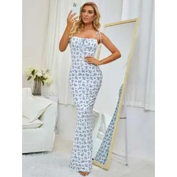 VKIHOC Women's Summer Bodycon Long Dress Tie Spaghetti Strap Sleeveless Backless Elegant Maxi Dresses Floral White L