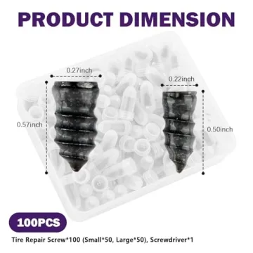 Show moreIntroducing the VKQTS 100PCS Car Tire Plug Kit — your ultimate solution for quick and effective tire repairs. This comprehensive kit includes 100 durable screw-in tire repair plugs in two sizes (50 large and 50 small), all neatly packed in a compact storage box along with a convenient screwdriver. Designed to be an essential addition to any car owner’s toolkit, this kit empowers you to tackle punctures with ease and confidence.