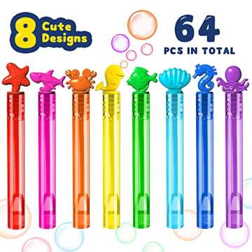 Show more Introducing the ultimate source of joy for children – the VKTEN Bubble Soap Liquid Set! This amazing super value pack includes 64 mini bubble wands, each showcasing 8 adorable sea world designs like Starfish, Shark, Crab, Dolphin, Fish, Shell, Seahorse, and Octopus, all in 8 vibrant rainbow colors. Perfect for creating memories, this set is an excellent addition to any party supplies and guarantees fun for kids of all ages.