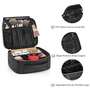 With its ample storage space, the Vlando organizer can hold a variety of makeup items including lipsticks, eyeshadows, brushes, skincare products, and even hair accessories. It's not just about storage; it's about organization too! The bag features several compartments and adjustable slots to neatly organize your tools. The added benefit of a PVC dust cover in the lid keeps everything dust-free and pristine.