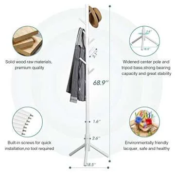 Show more The Vlush Sturdy Coat Rack Stand is an exquisite blend of modern and vintage charm, making it a striking addition to any home decor. Crafted from real wood and elegantly finished with environmentally-friendly lacquer, this coat rack presents a chic ivory white finish that complements your entryway, office, or bedroom effortlessly. Standing tall at 68.9 inches, it delivers a practical solution for your storing needs while enhancing your space's aesthetic appeal. Its thoughtful design includes 8 versatile hooks, allowing you to hang coats, jackets, hats, bags, and even scarves with ease. This multifunctional piece is not just a coat rack; it's a stylish statement about your organizational skills and taste. Less