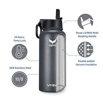 Vmini Wide Mouth Water Bottle - Insulated Steel, 32 oz, Straw Lid, Sleek Design