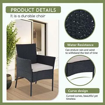 Show more Transform your outdoor space into an oasis of style and comfort with the Vnewone Patio Furniture Set. This exquisite 3-piece wicker patio set, featuring two plush cushioned chairs and a chic coffee table, is meticulously designed for both aesthetic appeal and functionality. Its modern color palette of black and khaki effortlessly blends with any garden, patio, or balcony decor, while the rattan weave provides robust durability against the elements. The soft cushions add a touch of sophistication, making it an alluring choice for anyone looking to enhance their outdoor experience.