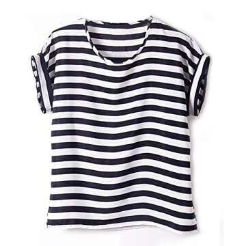 Crafted from lightweight chiffon, this t-shirt is adorned with a delightful black and white stripe pattern that is both trendy and versatile. The loose fit ensures comfort throughout the day, allowing for easy movement and a fashionable look. Ideal for layering or wearing solo, this piece stands out in any wardrobe.