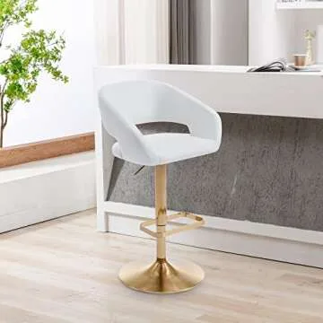 Show moreIntroducing the Vogue Furniture Direct Adjustable Bar Stool - a perfect blend of contemporary elegance and unparalleled comfort. This modern bar stool features a unique hollow back design and soft padded arms that offer both aesthetic appeal and ergonomic support. Covered in luxurious, textured PU leather, this versatile stool not only enhances your kitchen island or home bar but also adds a touch of sophistication to any café setting. The stylish pearl white finish paired with a gleaming gold base elevates your space while providing a functional seating solution.