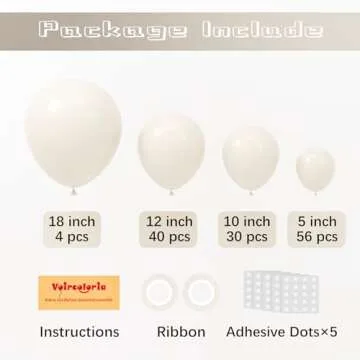 Show moreElevate Your Celebrations with the Voircoloria 130pcs White Sand Balloons Set! This exquisite collection of party balloons is designed to meet all your decoration needs, offering a harmonious blend of sizes and a stunning sand white hue to complement any theme. The set includes an impressive variety of 130 balloons: 56 pieces of 5 inches, 30 pieces of 10 inches, 40 pieces of 12 inches, and 4 pieces of 18 inches, allowing you to craft the most exquisite balloon garlands that add a touch of elegance and a layered effect to your event décor. Perfect for birthdays, weddings, or any celebration where you want to make a striking impression!