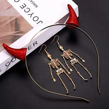Vokone Halloween Devil Horns Headband Festival Head Decoration with Halloween Skull Ghost Earrings Spooky Halloween Party Costume Accessory for Women (Skull)