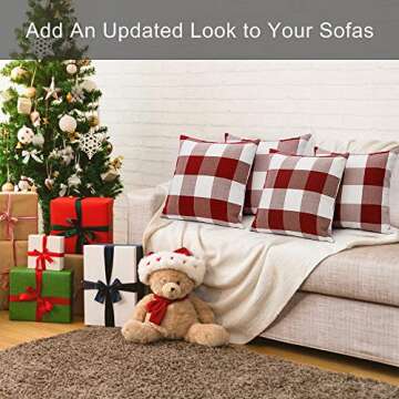 Show moreTransform your home this festive season with the Volcanics Christmas Pillow Covers. This beautifully crafted set includes four 18" x 18" decorative pillow covers, perfect for adding a touch of holiday spirit and farmhouse charm to any room. Made from a durable and skin-friendly thick polyester linen material, these covers feature a classic red and white buffalo check plaid design that brings warmth and coziness to your living space. Each cover is designed with a hidden zipper for a sleek appearance, ensuring your pillows stay beautifully encased without distracting from the aesthetic.