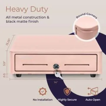 Show moreIntroducing the Volcora Cash Register Drawer, the perfect blend of style and functionality designed for both small and large scale businesses. Measuring 14" x 13.25" x 4" and adorned in a chic pink hue, this cash drawer not only enhances your counter’s aesthetic but also serves as a practical solution for managing your cash transactions. Built with a heavy-duty metal frame, it promises durability, ensuring your register drawer withstands the rigors of daily use. The cash drawer operates on a 24VDC voltage, making it reliable and efficient for your business needs.