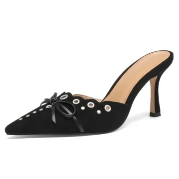 Show moreIntroducing the **VOLEECE Studded Heeled Mules** - the epitome of chic and comfort for today's fashionable woman! Made with high-quality **faux suede leather**, these shoes effortlessly combine trendy aesthetics with practicality. They feature a **slip-on design** that ensures quick wear, while the **pointed toe** elegantly elongates your legs, creating a sophisticated silhouette. Adorned with **eyelet detailing** and **silver studs**, these mules bring a touch of modern glamour to any outfit. Additionally, the **dainty bow** on the upper offers a playful and feminine twist, making these shoes perfect for both casual and formal occasions.
