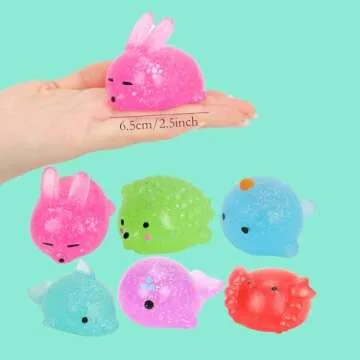 Show moreIntroducing a delightful set of 6 jumbo glittery squishy toys that promise to provide endless moments of joy and stress relief! Each toy features vibrant colors and cute animal shapes, designed for sensory play. Manufactured with high-quality, non-toxic TPR material, these squishies not only meet US toy standards but are also safety test approved. Measuring double the size of standard mini squishies, their shimmering glittery appearance makes them visually appealing and more popular than regular mochi toys.