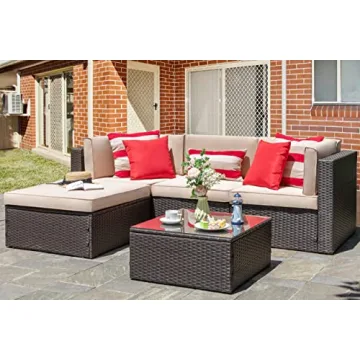 Show more Transform your outdoor space into a stylish and comfortable haven with the Vongrasig 5 Piece Patio Furniture Set. This exquisite sectional set is thoughtfully constructed with a solid powder-coated steel frame ensuring exceptional durability and rust-resistance, perfect for year-round outdoor use. Each piece is hand-woven with resilient resin wicker, designed to withstand the toughest weather conditions while maintaining its elegance. The modern aesthetic not only enhances your backyard or garden but also creates an inviting atmosphere for socializing by the poolside.