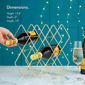 Show moreIntroducing the VonShef 8-10 Bottle Wine Rack, a stunning piece designed to be both functional and a conversation starter in your home. Sporting a gorgeous brushed gold finish, this wine rack's minimalist geometric design harmonizes with any kitchen or bar decor, offering a perfect spot for your favorite bottles. Measuring a compact 13" x 6" x 13", it’s ideal for countertops, blending style with practicality. Its robust structure can hold up to 10 bottles, making it perfect for wine enthusiasts who appreciate both aesthetics and utility.