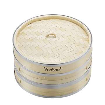 VonShef Premium 2 Tier Bamboo Steamer with Stainless Steel Banding Includes 2 Pairs of Chopsticks and 50 Wax Steamer Liners, Perfect For Steaming Dim Sum Dumplings Buns Vegetables Fish Rice, 10 Inches