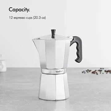 Show moreDiscover the rich and aromatic world of espresso with the VonShef Stovetop Aluminium Espresso Maker Moka Pot. Crafted with the perfect blend of style, functionality, and durability, this sleek chrome espresso maker is designed to bring a touch of sophistication to your kitchen while delivering exceptional coffee flavor. With a generous capacity of 12 espresso cups, it's ideal for coffee enthusiasts who enjoy brewing for family or friends. This elegant pot not only brews quickly, but it also stands out as an affordable and compact alternative to larger espresso machines.
