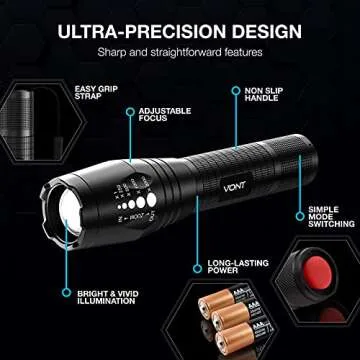 Show moreIntroducing the Vont LED Tactical Flashlight – your ultimate companion for all outdoor adventures! This innovative flashlight combines state-of-the-art technology with rugged durability, making it a must-have for campers, hikers, or anyone who values reliable lighting in their everyday life. Each flashlight features proprietary LEDs that deliver a brilliant brightness output, ensuring you can light up paths, trails, and campsites even in complete darkness. With a lifespan of over 20,000 hours, say goodbye to frequently replacing lightbulbs!