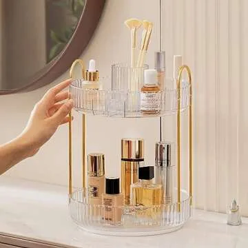 Vorey 360 Rotating Makeup Organizer Countertop with Cosmetic Brush Holder, 2 Tier Bathroom Organizer Spinning Perfume Organizers Skincare Organizers Dresser Organizer Makeup Carousel, Clear