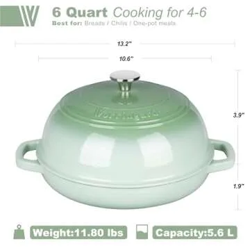 Show more Introducing the VORRINGARD Enameled Cast Iron Dutch Oven Pot: This 6-quart versatile baking essential is designed to elevate your culinary creations, especially for avid bread bakers. Crafted from heavy-duty cast iron, this pot ensures robust heat retention and even heat distribution, resulting in perfectly baked sourdough and delicious homemade loaves. With its stunning green finish, it doesn’t just perform beautifully in the kitchen; it also serves as an eye-catching serving piece straight from oven to table.