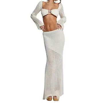 Votuleazi Women’s 2 Piece Skirt Set Crochet Knitted Sexy Crop Top Y2k Low Waist Bodycon Knit Maxi Skirt Summer Matching Sets(A White,S)