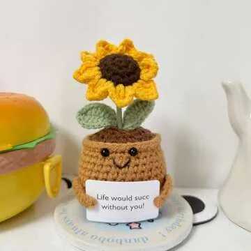 In summary, whether you're treating yourself or surprising someone special, this crochet sunflower is sure to bring a smile and a splash of color to any environment. It's not just a decoration; it's a heartwarming gift that uplifts the spirit with its funny and positive design. Less