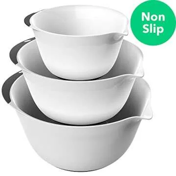 Vremi 3 Piece Plastic Mixing Bowl Set - Nesting Mixing Bowls with Rubber Grip Handles Easy Pour Spout and Non Slip Bottom - Three Sizes Small Large Capacity for Kitchen Baking Salad - White and Black