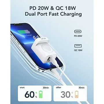 But what truly sets the VRURC charger apart is its smart and multifunctional design. Equipped with a dual port fast charging block, it boasts a robust 20W USB-C port and an 18W USB port, allowing simultaneous charging for your Apple Watch and other devices, including the latest iPhones and Samsung smartphones. Experience the thrill of rapid charging that can boost your smartphone's battery to 60% in just 30 minutes! Whether for home, office, or travel, this versatile charger ensures you have the power you need, precisely when you need it.