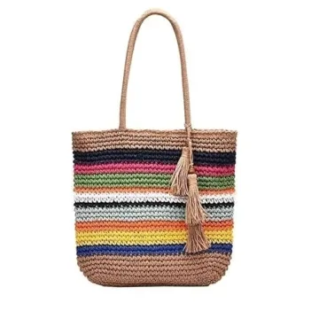 Show moreIntroducing the ultimate companion for your sunny adventures - our colorful multi-colored rainbow striped woven natural straw beach bag tote. This vibrant tote is perfect for those who love a splash of color in their summer wardrobe. Crafted with meticulous attention to detail, this tote features a stunning tassel woven belt decor that adds a fashionable touch.