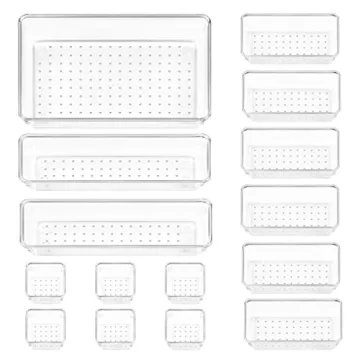Show moreTransform your cluttered drawers into models of organization with the Vtopmart 15 PCS Clear Plastic Drawer Organizers Set. Designed to fit any drawer in your home, these versatile organizers are perfect for keeping your makeup, jewelry, office supplies, and kitchen utensils neatly arranged and easily accessible. Made from durable, clear plastic, you can see exactly what's inside without having to dig through a mess. The set includes 15 pieces in four different sizes, allowing for customizable combinations to suit your specific storage needs. Plus, with the included 100 silicone pads, these organizers stay securely in place, preventing slips and slides. Stack them when not in use to save space, and enjoy the ease of cleaning with just a damp cloth. Say goodbye to clutter and hello to a beautifully organized home with Vtopmart's drawer organizers.
