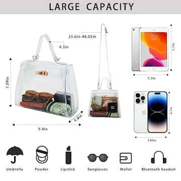 Show moreIntroducing the VUIASK Clear Bag - your ultimate companion for events, concerts, and everyday outings! Designed with the modern individual in mind, this trendy shoulder bag not only meets stadium regulations but also enhances your style, making it the perfect blend of functionality and fashion. With dimensions of 9.4x4x7 inches, it accommodates all your essentials including iPads, mobile phones, wallets, cosmetics, and even an umbrella with ease. This bag liberates your hands and simplifies your outings, whether attending a thrilling concert or navigating through bustling stadiums.