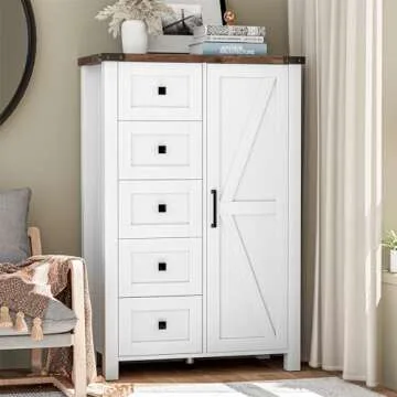 VVFLU Farmhouse Dresser Storage Cabinet Chest of Drawer for Bedroom, 5 Drawer Dresser with Barn Door, 48 Inch Tall White Wood Dresser, Adjustable Shelves, Rustic, for Living Room, Entryway, Hallway