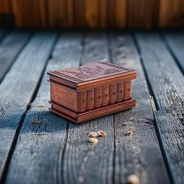 Show more This exquisite wooden puzzle box is not just a gift; it's an experience waiting to unfold. Crafted from solid recycled sycamore wood, each box showcases meticulous craftsmanship infused with soul and tradition. Hand-carved with Transylvanian motifs, reminiscent of the era of Vlad the Impaler, this medium difficulty puzzle box presents a delightful challenge as you discover its intricately hidden compartments. The rich color, attained through a secret blend of natural oils and lacquers, offers a smooth touch that enhances its elegant aesthetics. Imagine the joy of unlocking a mystery within the box, with the average time to open it at around 15 minutes!
