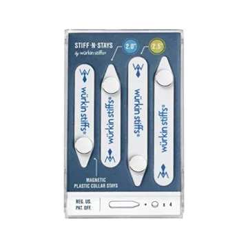 Show more Revolutionize your collar game with the innovative Stiff-N-Stays and Power Buttons from Wurkin Stiffs. This cleverly designed product provides an effortless solution for achieving a polished and professional collar look in mere seconds. Say goodbye to floppy collars and hello to a refined appearance that will elevate any outfit. Crafted from durable plastic, the Stiff-N-Stays offer unrivaled strength and style, allowing you to enjoy crisp collars whether you’re at a business meeting or a casual outing. These collar stays are not only functional but also a must-have accessory for the modern individual who values appearance.