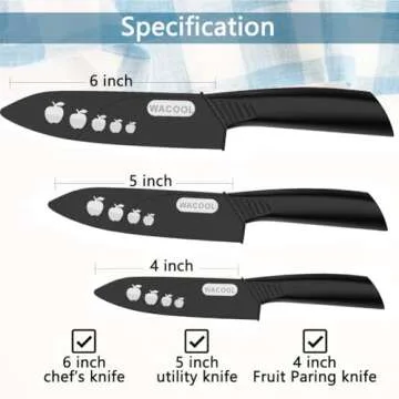 Show more Experience culinary precision and elegance with the WACOOL Ceramic Knife Set. Effortlessly slicing through your favorite ingredients has never been easier, thanks to the exceptionally sharp, ultra-lightweight ceramic blades that deliver swift performance with minimal resistance. This exquisite three-piece set includes a 6-inch Chef's Knife, a versatile 5-inch Utility Knife, and a delicate 4-inch Fruit Paring Knife, all featuring a classic white blade paired with a sleek black handle for a timeless aesthetic. Plus, each knife comes with a matching sheath, ensuring safety and convenience when storing your tools.